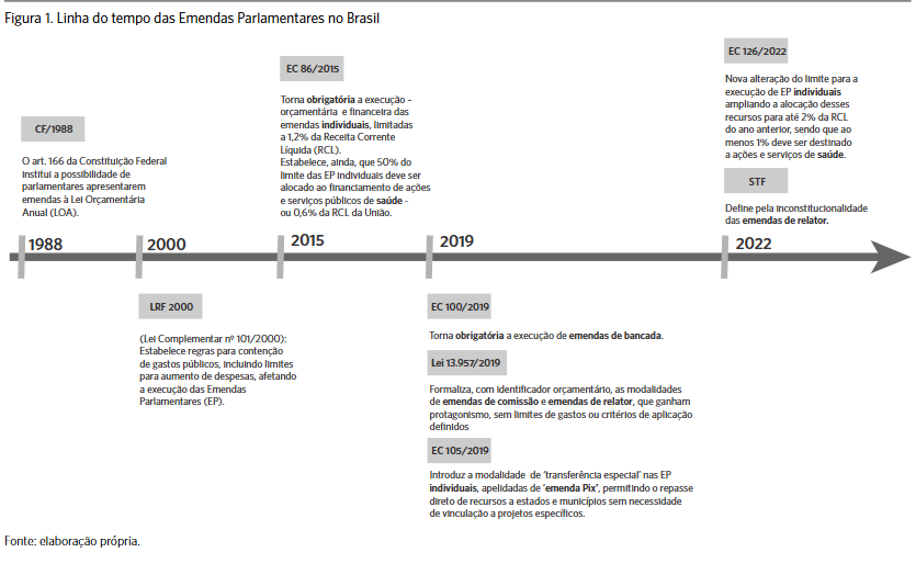 As Emendas Parlamentares (EP) estão previstas no ordenamento jurídico brasileiro desde a Constituição Federal de 1946 (CF/1946), mas a sua utilização foi cerceada no bojo da estratégia de controle e concentração do poder nacional pelos militares à frente do Executivo, no governo ditatorial militar, entre 1964 e 1985 [3]. No contexto da redemocratização, as EP voltaram a ser aceitas na comissão mista de orçamento apenas sob a forma de emendas de bancada e exclusivamente visando à anulação de despesa devida a erros ou omissões da peça apresentada pelo Poder Executivo, ou ainda por incompatibilidade com o planejamento estratégico do governo federal [4].