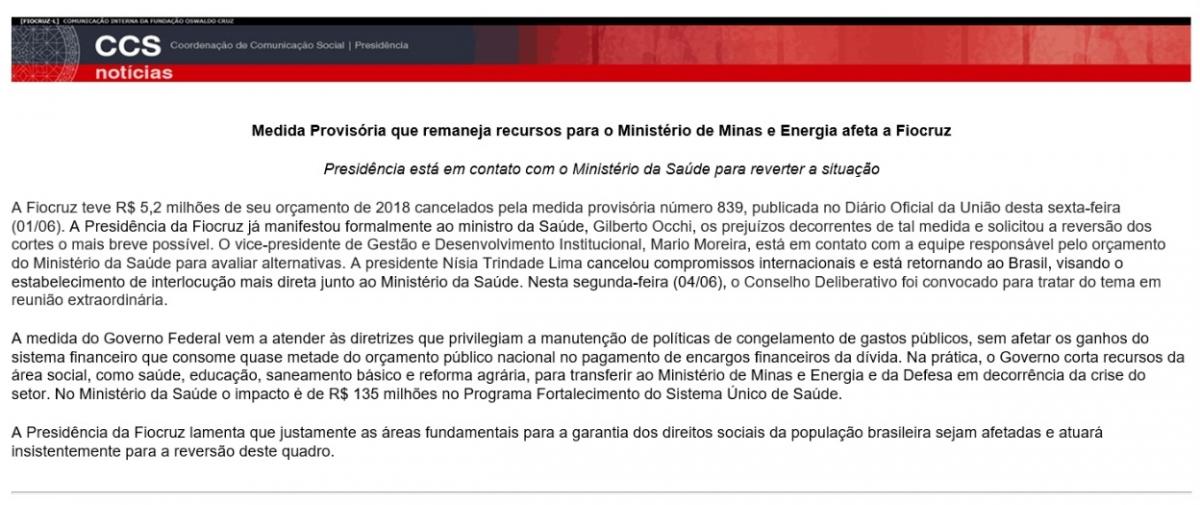 A Associação Brasileira de Saúde Coletiva (Abrasco) e o Centro Brasileiro de Estudos de Saúde (Cebes), entidades históricas do Movimento da Reforma Sanitária, divulgaram notas [aqui e aqui] de repúdio à medida Provisória 839 do governo federal, que corta recursos da área social buscando acomodar o gasto extra de R$ 9,58 bilhões com o qual quer bancar subsídio ao diesel. Também em nota, a Fundação Oswaldo Cruz anunciou que os cortes cancelam R$ 5,2 milhões do orçamento de 2018 da instituição e que já solicitou formalmente ao ministro da Saúde a reversãodos cortes.